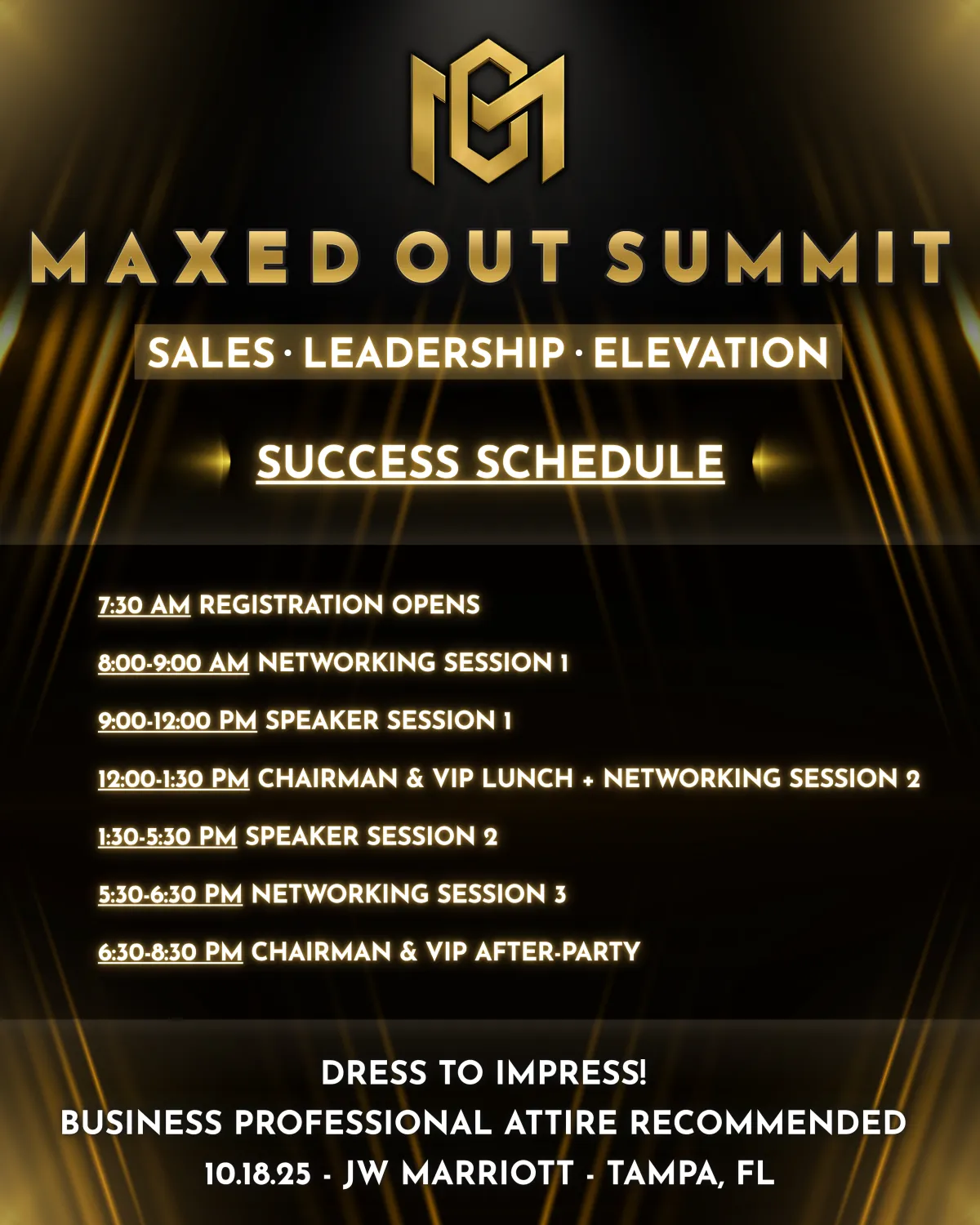 Here is your opportunity to take action. Attend the Maxed Out Summit and finally get the breakthrough you've been chasing. Learn from people who've actually done what you want to do. Walk away with a clear roadmap and the tools to implement it.